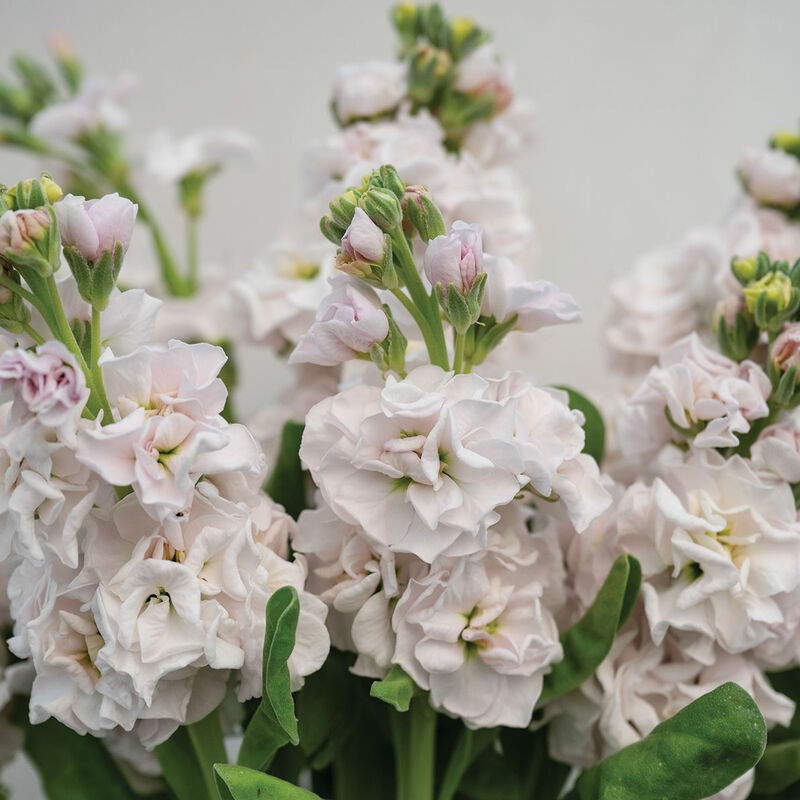Softly blushing with the palest silver-pink, Silver unfolds with an old-world grace that feels both heirloom and celestial. Each tall stem bears a column of densely ruffled blooms, their velvety petals releasing a gentle, spicy fragrance that lingers in the air. The effect is timeless—like candlelight reflecting off silk, tender and luminous all at once.